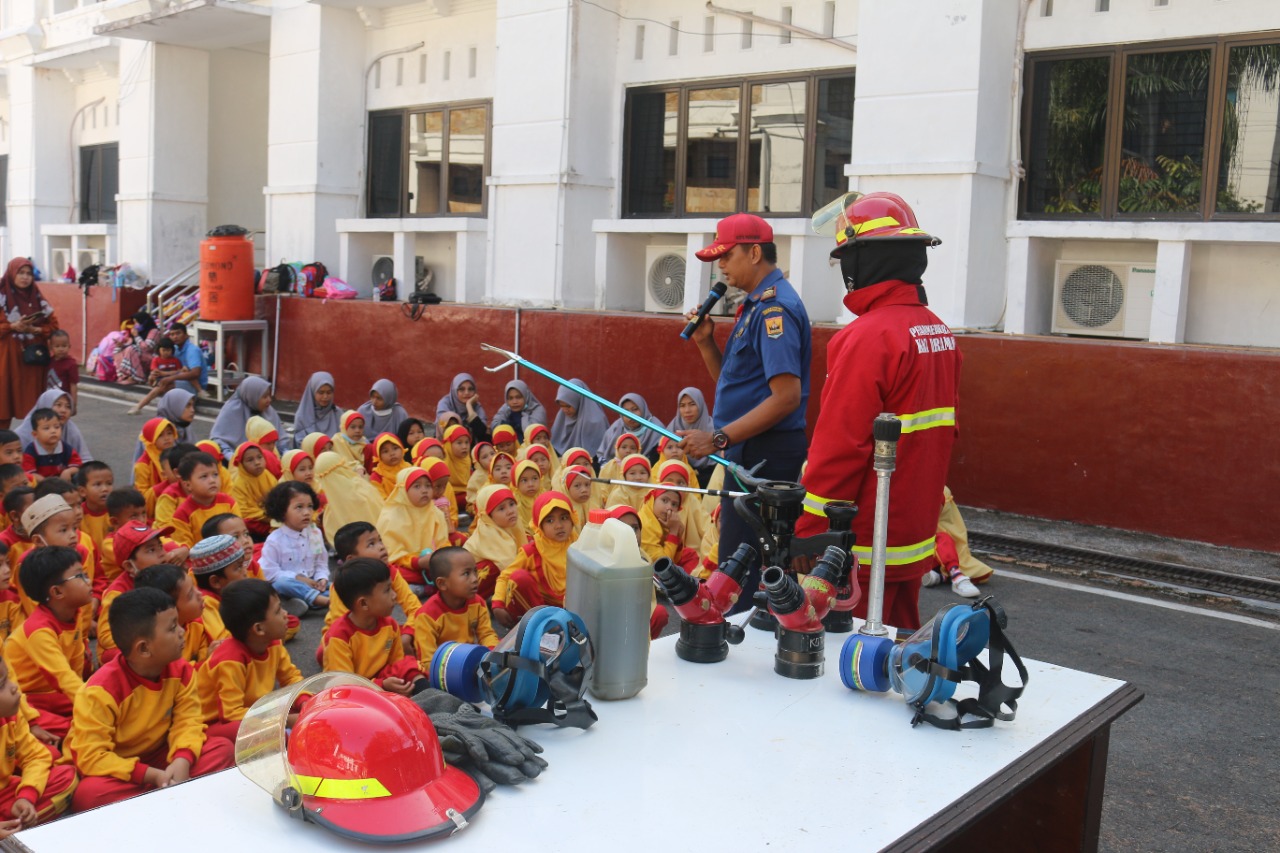 Dengan didampingin guru dan beberapa wali murid, anak-anak diedukasi seputar keamaanan dan pencegahan kebakaran serta pengenalan Damkar itu sendiri.